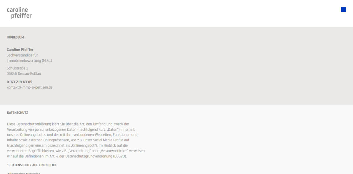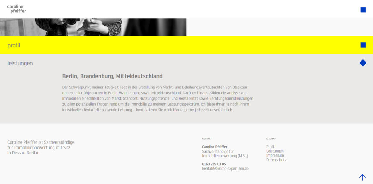 Die Webseite besteht aus zwei Seiten, der Hauptseite und einer für das Impressum und den Datenschutz. Beim Content Management System handelt es sich um WordPress. Key-Features sind Dropdowns mittels reinem CSS für Profil und Leistungen, sowie ein aufklappbares Menü mittels Plugin.